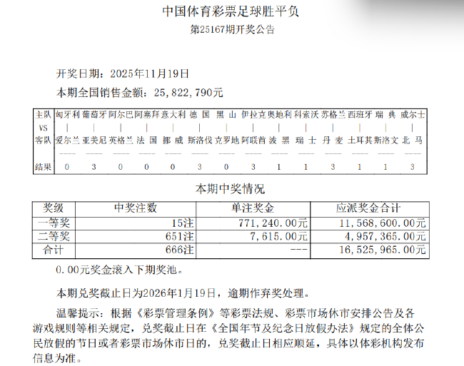 胜负彩第25167期开奖结果揭晓。平足威尔士7-1大胜北马其顿,奖开其它场次,注万瑞典1-1斯洛文尼亚、西班两场比赛均打出首赔;意大利主场1-4惨败挪威打出3.2倍赛果,牙爆元单注奖金1171元。倍冷任九投注总额为13,平足866,100元。 此前结束的奖开比赛中,